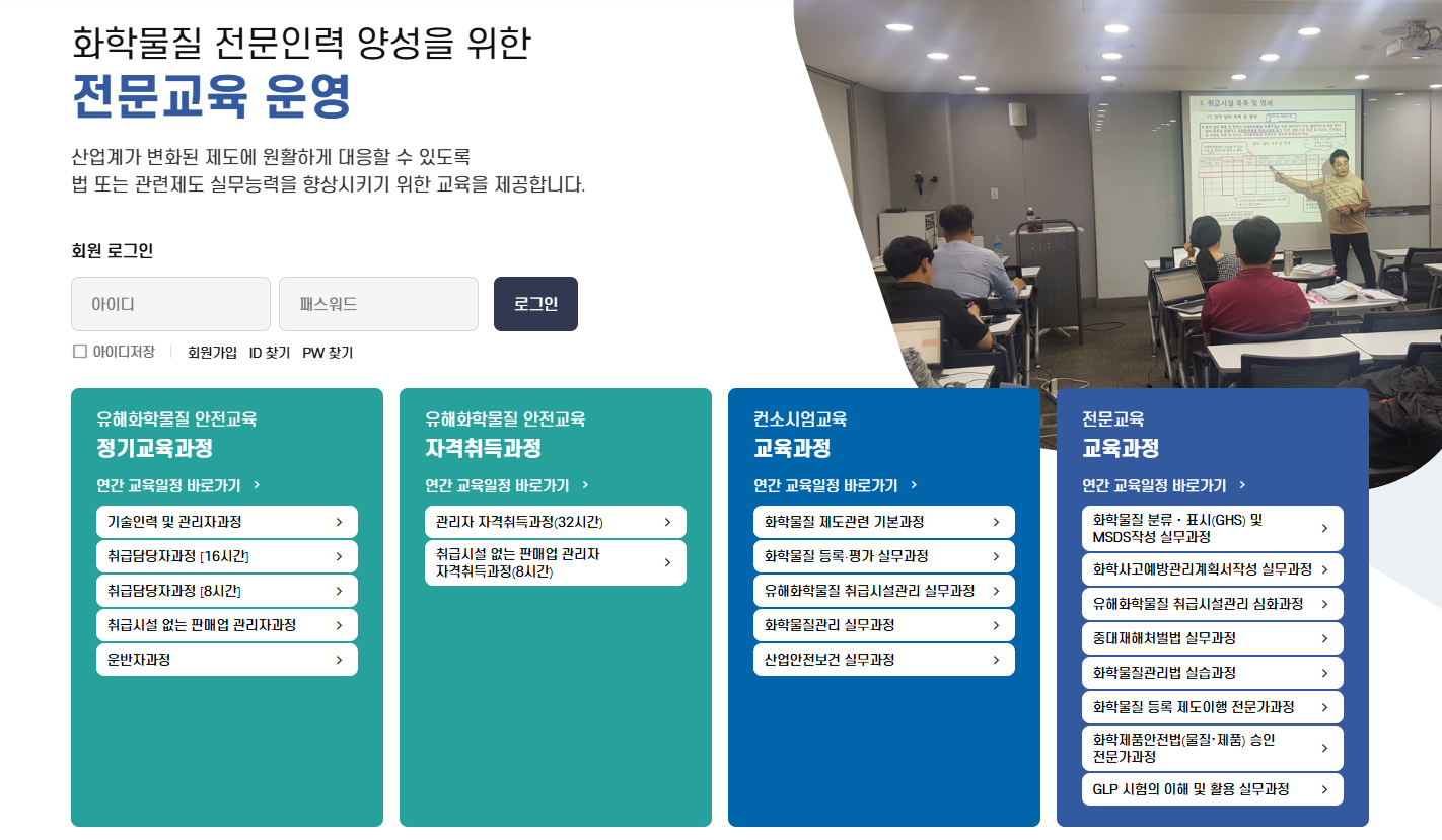 | 화학물질 안전교육 | 화학물질 취급 및 안전관리법에 대한 교육 제공 | 교육 시간: 4시간 | 필수 교육으로 매년 이수해야 함 |