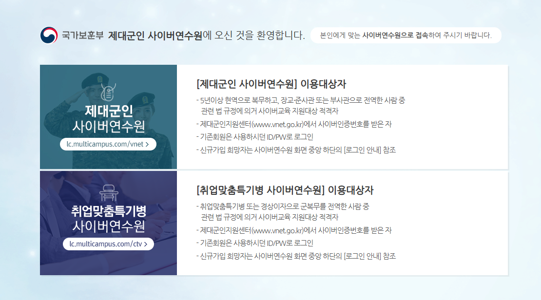 제대군인지원센터 사이버연수원은 제대군인에게 필요한 다양한 교육 프로그램 및 연수를 제공합니다. 이는 군 복무 후 재취업을 위한 역량 강화, 직무 교육, 인성 교육 등으로 구성되어 있으며, 온라인으로 접근이 가능하므로 시간과 장소에 구애받지 않고 학습할 수 있습니다.