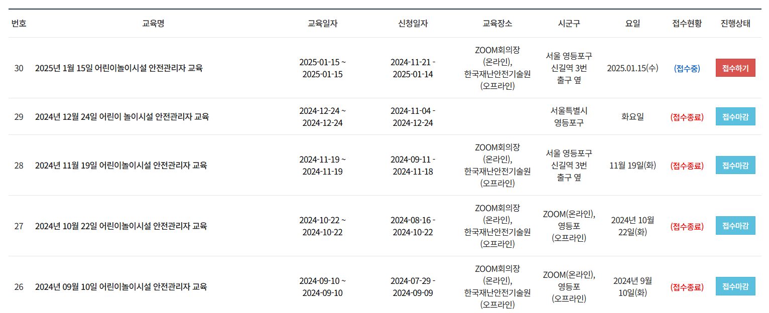 교육은 온라인 및 오프라인으로 진행됩니다. 온라인 교육은 영상 강의 및 자료를 활용하여 시간과 장소에 구애받지 않고 참여할 수 있으며, 오프라인 교육은 현장 실습과 함께 진행 되어 안전 관리에 대한 실질적인 경험을 쌓을 수 있습니다.